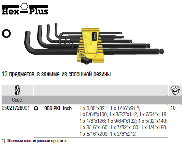 Набор высококачественных дюймовых Г-образных ключей под внутренний шестигранник. В практичном зажиме из износостойкого материла для длительного надёжного хранения и одновременно простого извлечения ключей. Г-образный ключ Hex-Plus: увеличивает площадь контакта с головкой винта. За счёт этого до минимума снижается концентрация напряжения в профиле, что практически исключает вероятность разрушения головки винта. Шариковый наконечник на длинной стороне позволяет уверенно работать даже в сложных условиях монтажа. Обработка поверхности по технологии BlackLaser обеспечивает отличную защиту, в т.ч. от коррозии, а также долгий срок службы инструмента. Нанесённая лазером, а потому износостойкая маркировка размера помогает быстро отыскать нужный ключ.
