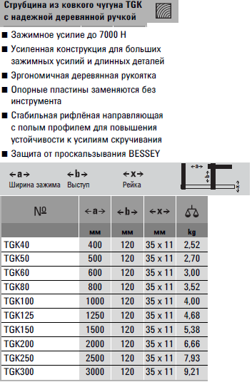 BE-TGK125 TGK125 Струбцина чугунная 1250/120, 7 кН, деревянная ручка, для высоких нагрузок 18828р.