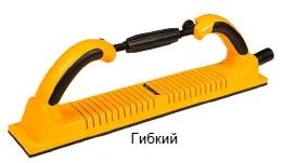 Гибкий шлифовальный блок – это универсальный инструмент, который подходит для обработки поверхностей как выпуклой, так и вогнутой формы. Для удобства регулировки радиуса изгиба блока на рукоятке инструмента предусмотрены желтые отметки (положение прямо) и отметка красного цвета (минимальный радиус изгиба).